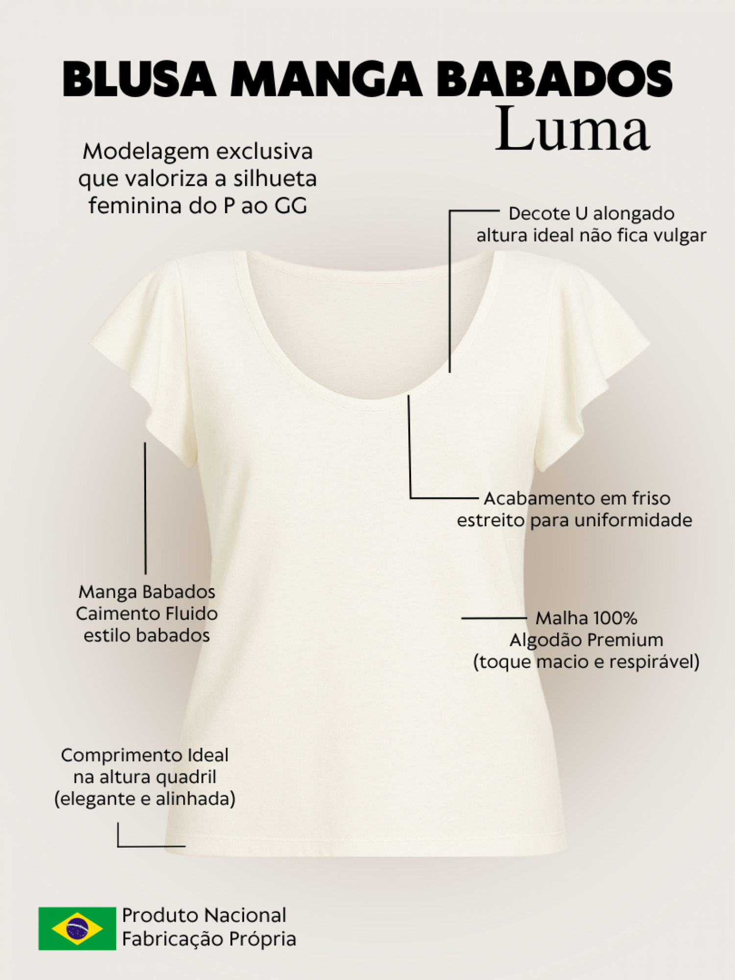 A blusa com manga babados Luma precisa de cuidados especiais na hora da lavagem para garantir sua durabilidade e qualidade. Recomendamos que seja lavada a mão, com sabão neutro, em temperatura ambiente. Nunca deixar de molho por muito tempo, ou misturar com peças de cores fortes, pois o molho prolongado força a peça a soltar tinta na água e manchar outras cores. Nunca esfregue a peça com força em um pouco específico para tirar alguma mancha, pois a fricção exagerada da peça pode desbotar ou denegrir a fibra do algodão. Seque a peça na sombra para evitar desbotamento. Seguindo essas recomendações, você manterá seu produto em perfeitas condições por muito mais tempo.