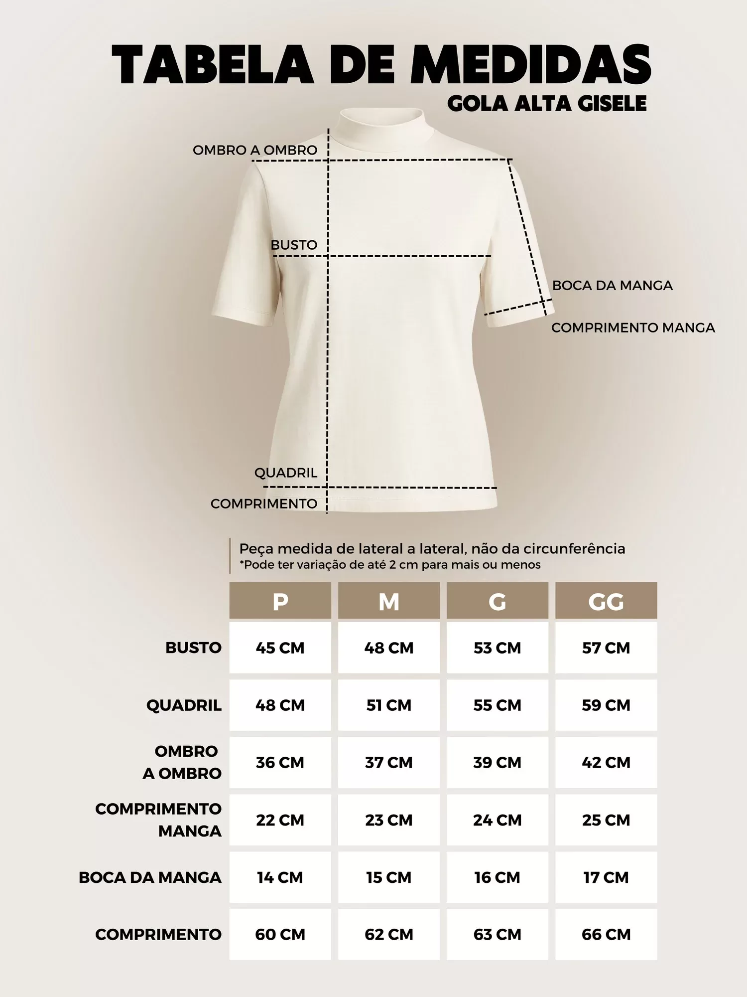 Essas são as medidas do comprimento da camiseta Gisele: