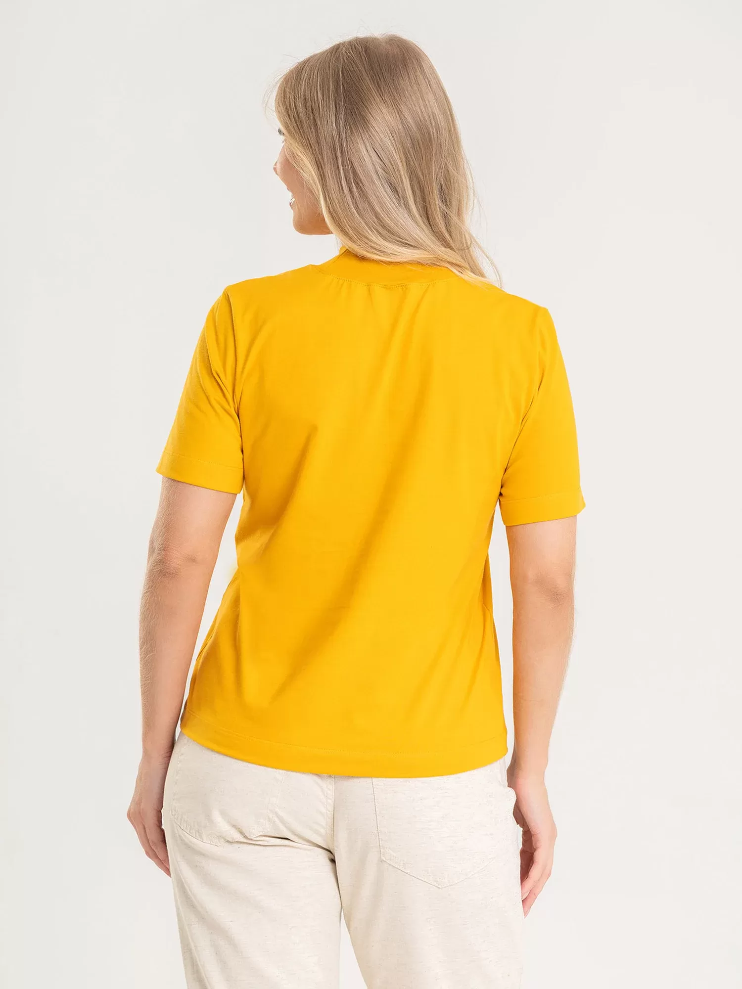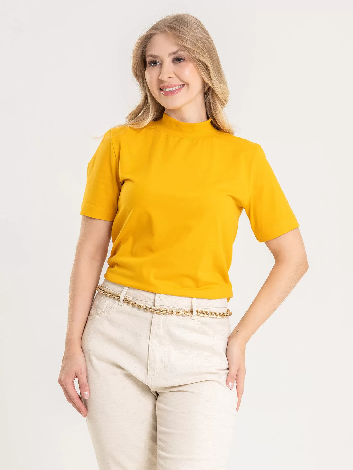 A Blusa Feminina Gola Alta de Algodão Gisele Amarelo Sol une conforto, estilo e luminosidade em uma única peça. Com modelagem reta e exclusiva Anazê, valoriza a silhueta com naturalidade e elegância. Feita em malha 100% algodão premium, oferece toque suave, respirabilidade e caimento impecável — perfeita para o dia a dia com leveza.A gola alta canelada dá estrutura ao visual, enquanto as mangas curtas alongadas equilibram proporção e elegância. O Amarelo Sol ilumina o look e combina com vários tons criando contrastes modernos e cheios de vida.