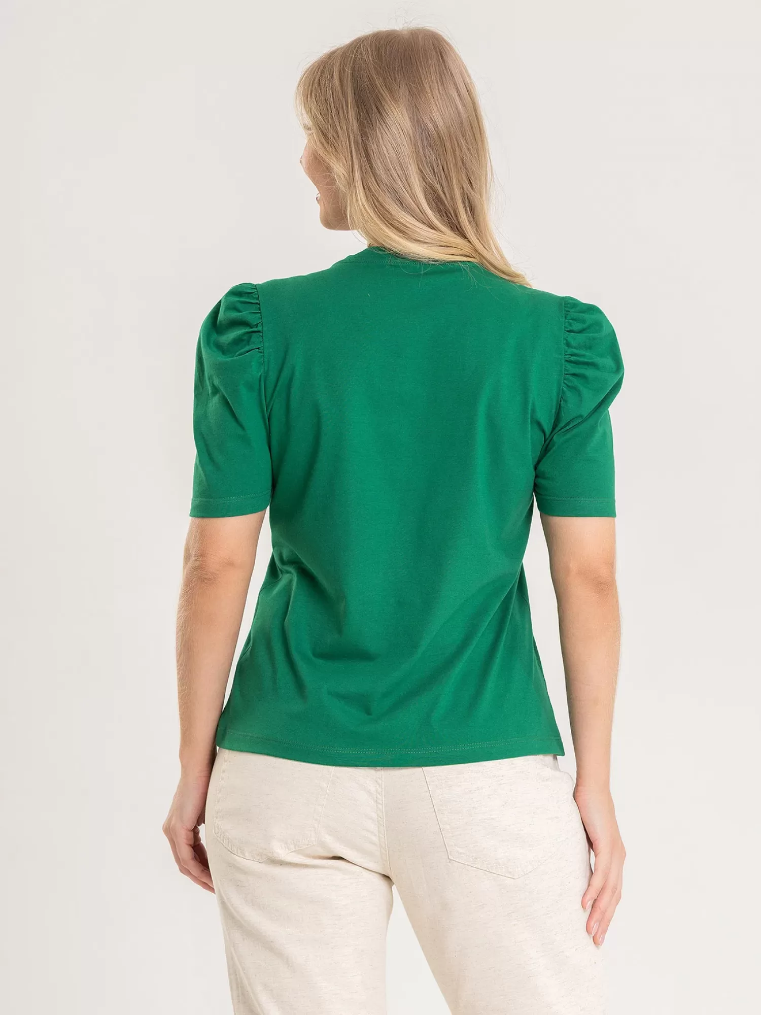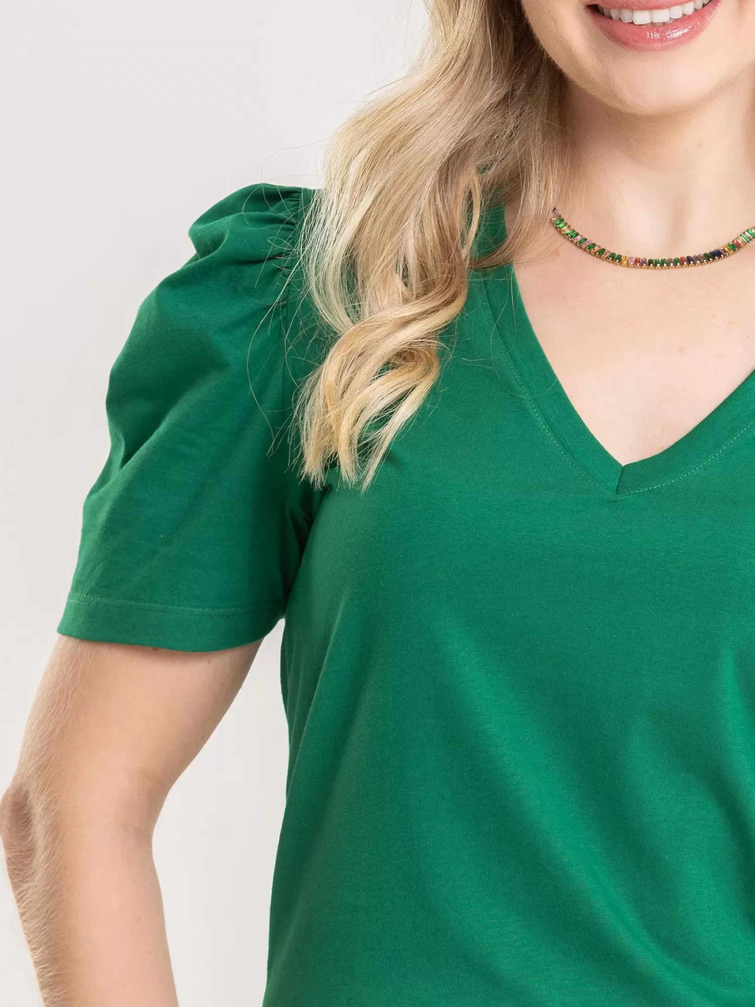 A Blusa Feminina Manga Bufante Decote V de Algodão Alice na cor Verde Folha é um básico repaginado que une conforto e estilo natural. Confeccionada em malha 100% algodão de alta qualidade, tem toque macio, excelente respirabilidade e resistência — não desbota e não forma bolinhas. A modelagem exclusiva da Anazê valoriza a silhueta com leveza, enquanto as mangas bufantes e o decote V trazem um ar delicado e feminino. O Verde Folha é uma cor atual e fácil de combinar com tons neutros como areia, branco e jeans, além de contrastar lindamente com tons profundos como marinho e grafite.