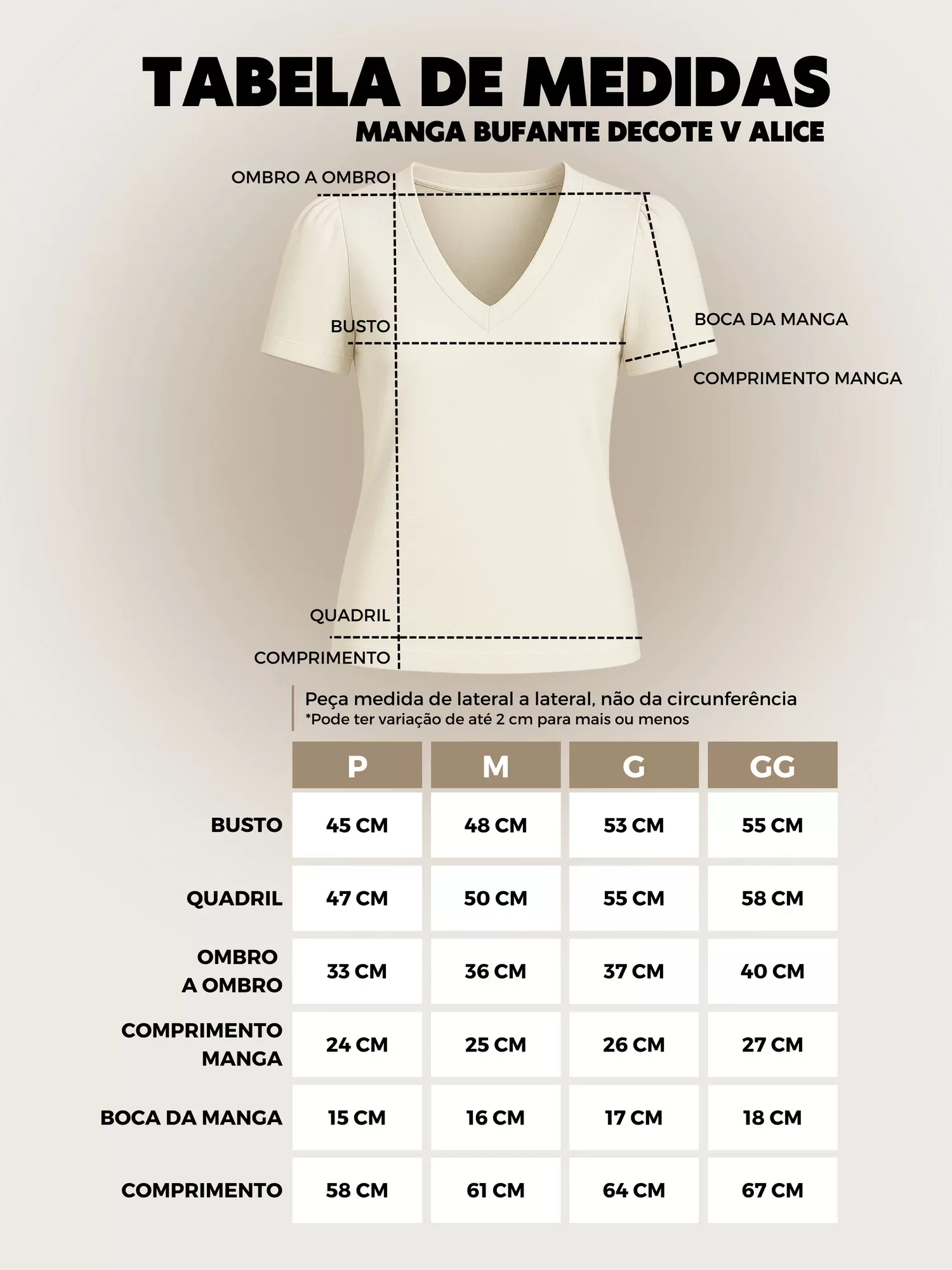 A blusa de manga bufante decote V Alice precisa de cuidados especiais na hora da lavagem para garantir sua durabilidade e qualidade. Recomendamos que seja lavada a mão, com sabão neutro, em temperatura ambiente. Nunca deixar de molho por muito tempo, ou misturar com peças de cores fortes, pois o molho prolongado força a peça a soltar tinta na água e manchar outras cores. Nunca esfregue a peça com força em um pouco específico para tirar alguma mancha, pois a fricção exagerada da peça pode desbotar ou denegrir a fibra do algodão. Seque a peça na sombra para evitar desbotamento. Seguindo essas recomendações, você manterá seu produto em perfeitas condições por muito mais tempo.
