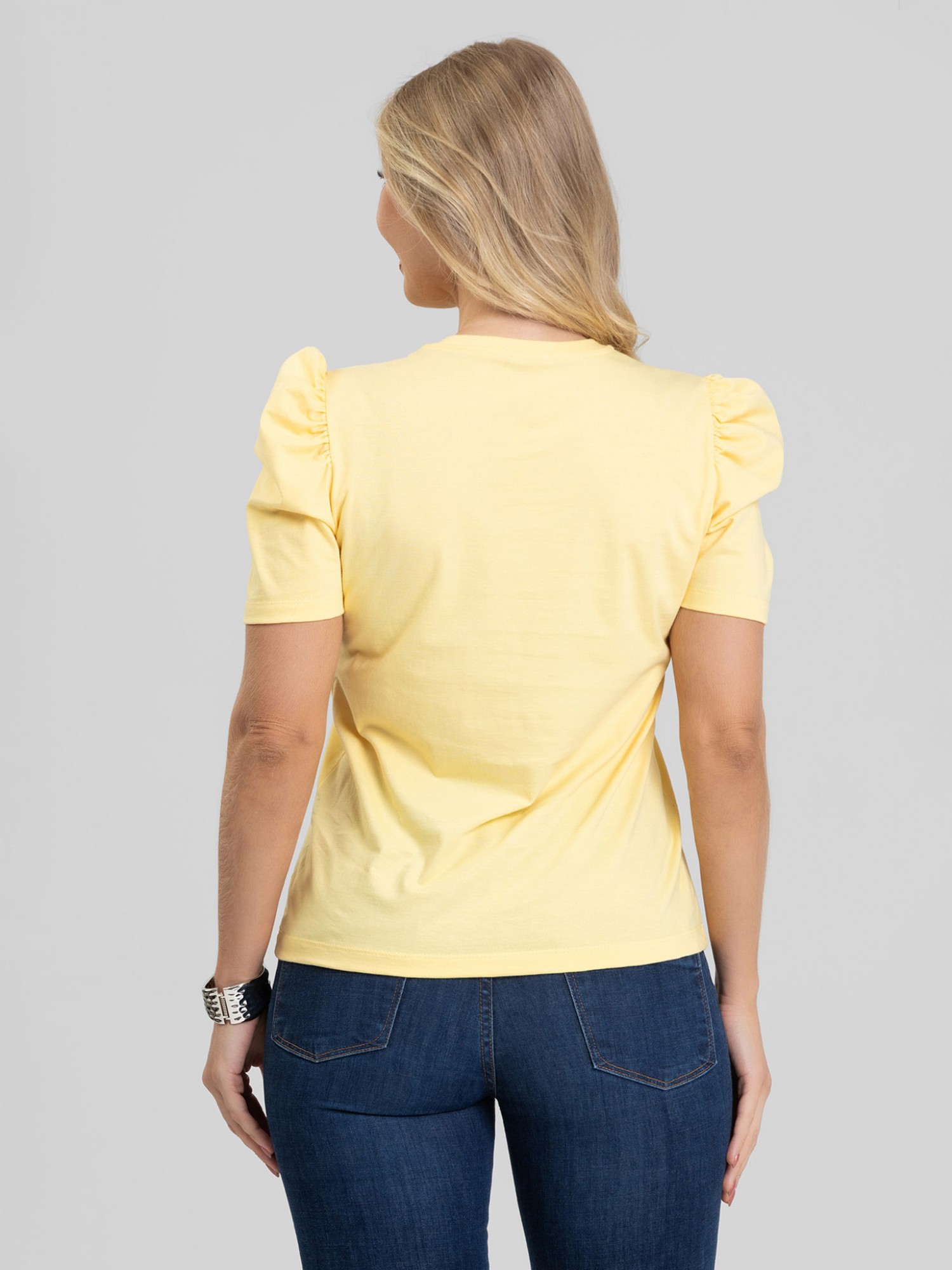 A Blusa de manga bufante Serena no tom Amarelo Manteiga garante leveza e frescor ao visual, sem perder a elegância que a modelagem da manga bufante traz. Feita em malha 100% algodão premium, é respirável, macia e confortável para todas as estações. O franzido interno das mangas cria estrutura com delicadeza, enquanto o decote redondo em ribana canelada garante um caimento impecável. O Amarelo Manteiga ilumina a produção e combina com jeans, tons neutros, peças claras e até com terrosos para um look sofisticado.