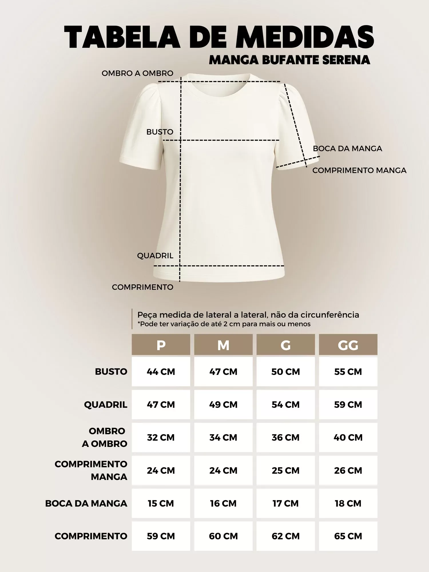 A Blusa manga bufante Serena precisa de cuidados especiais na hora da lavagem para garantir sua durabilidade e qualidade. Recomendamos que seja lavada a mão, com sabão neutro, em temperatura ambiente. Nunca deixar de molho por muito tempo, ou misturar com peças de cores fortes, pois o molho prolongado força a peça a soltar tinta na água e manchar outras cores. Nunca esfregue a peça com força em um pouco específico para tirar alguma mancha, pois a fricção exagerada da peça pode desbotar ou denegrir a fibra do algodão. Seque a peça na sombra para evitar desbotamento. Seguindo essas recomendações, você manterá seu produto em perfeitas condições por muito mais tempo.