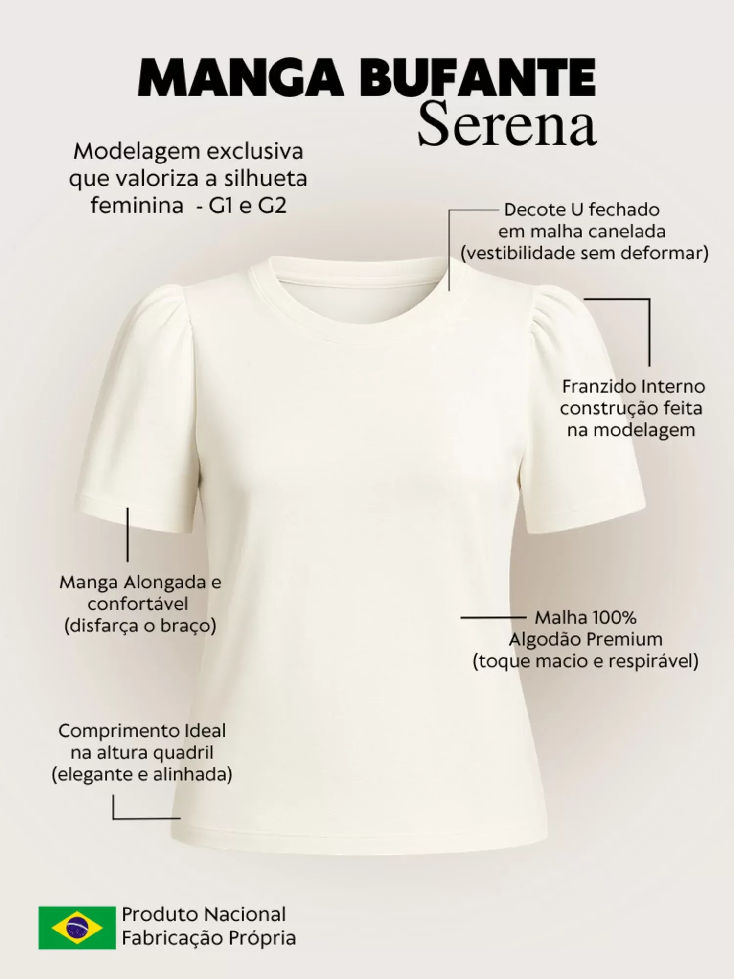 A blusa manga bufante Serena plus size branca combina elegância, conforto e atemporalidade. Desenvolvida em malha 100% algodão premium, traz decote redondo em ribana, modelagem levemente acinturada e mangas bufantes com franzido interno, que valorizam o corpo plus size de forma natural. Seu comprimento é perfeito para usar de várias formas, adaptando-se a diferentes estilos e ocasiões. Uma peça essencial, com caimento impecável e confeccionada no Brasil.