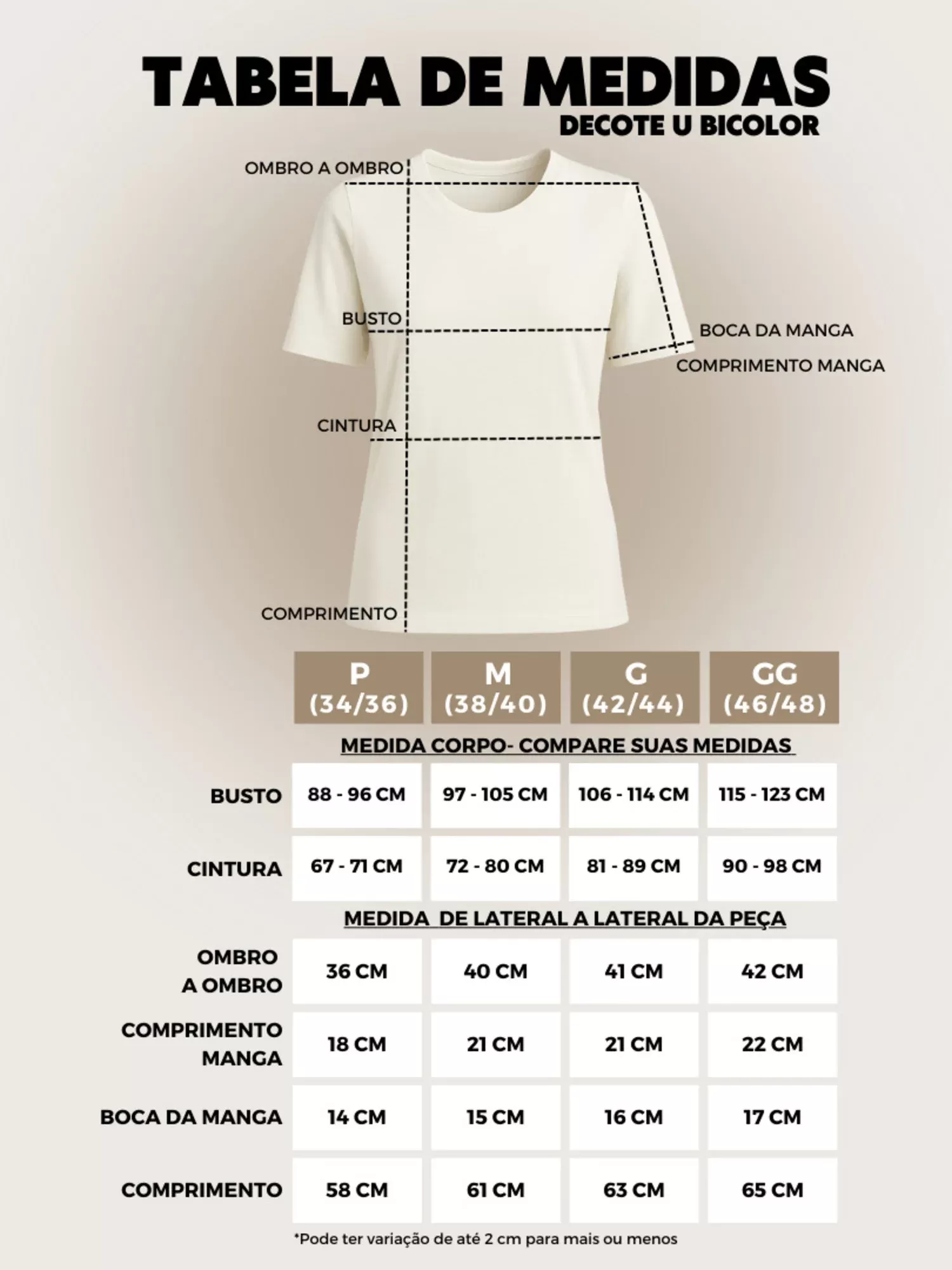 Esse modelo tem a base mais reta, apenas com um leve acinturado. Pela tabela de medidas podemos acompanhar a medida do busto e depois da circunferência da barra. A medida da circunferência da peça na região da cintura é de 2 a 3 cm maior que a medida do busto.