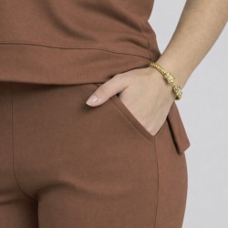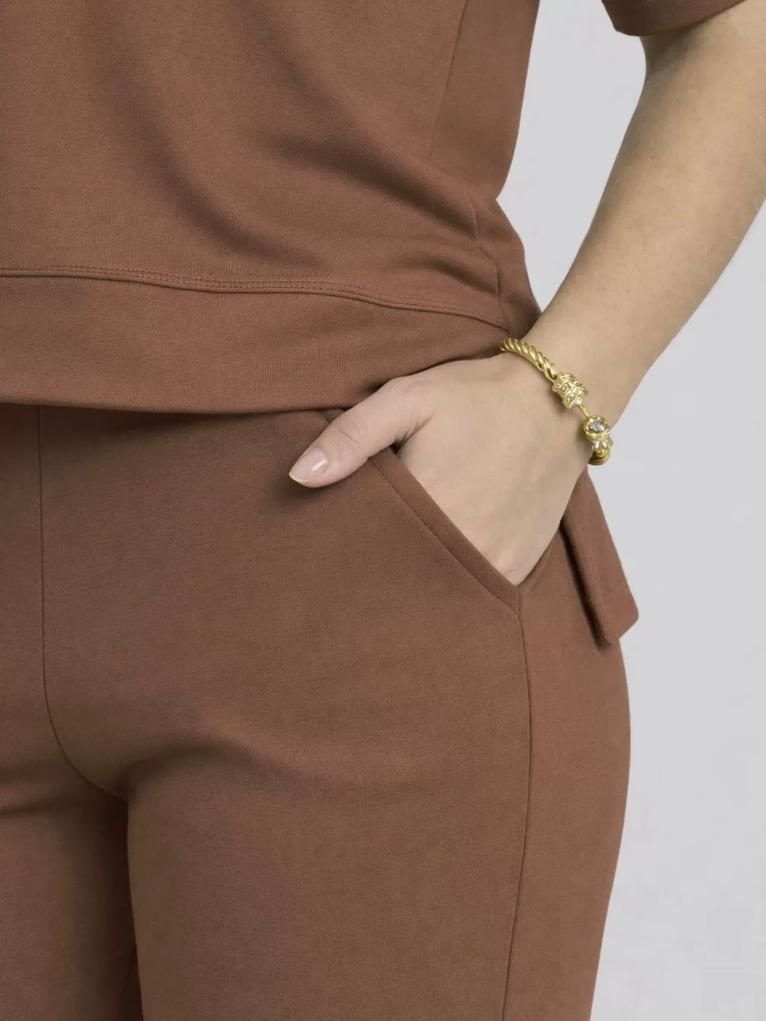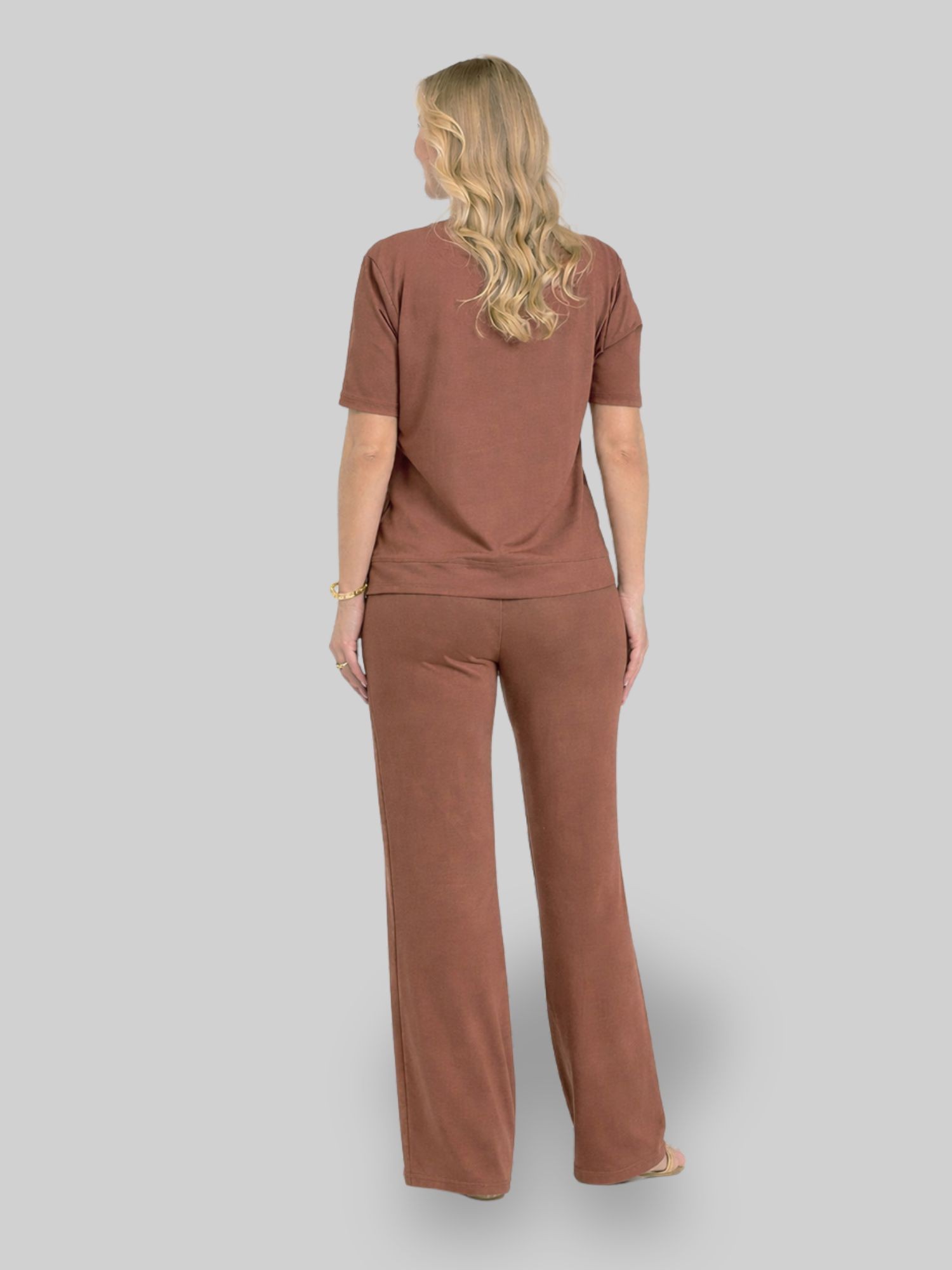O Conjunto em Molecotton de Viscose foi pensado para acompanhar sua rotina com leveza, conforto e elegância — sem abrir mão da praticidade. Confeccionado em molecotton de viscose com elastano, conta com a tecnologia do fio vortex, que proporciona um toque extremamente macio, maior durabilidade e menor formação de bolinhas, mantendo a peça bonita por muito mais tempo. A blusa possui decote redondo, mangas levemente mais longas e fendas laterais que trazem movimento ao vestir. A modelagem, com frente mais curta e costas alongadas, valoriza o caimento no corpo e garante mais segurança no uso. A calça vem com cós largo e elástico, oferecendo firmeza e conforto na medida certa. O bolso faca funcional agrega praticidade, enquanto a barra com leve abertura flare traz fluidez ao visual e ajuda a alongar a silhueta. Um conjunto versátil, sofisticado e atemporal — perfeito para quem busca unir estilo e conforto no dia a dia.