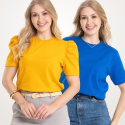 2 camisetas em malha 100% algodão premium: Um modelo de manga bufante na cor amarelo e o outro modelo de camiseta básica na cor azul bic. Não desbota, não dá bolinha e veste o corpo real realçando a silhueta feminina.