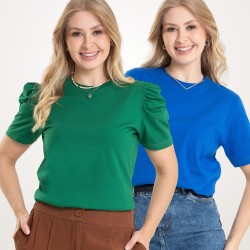 2 camisetas em malha 100% algodão premium: Um modelo de manga bufante na cor verde folha e o outro modelo de camiseta básica na cor azul bic. Não desbota, não dá bolinha e veste o corpo real realçando a silhueta feminina.