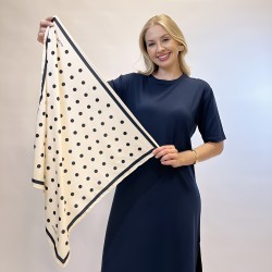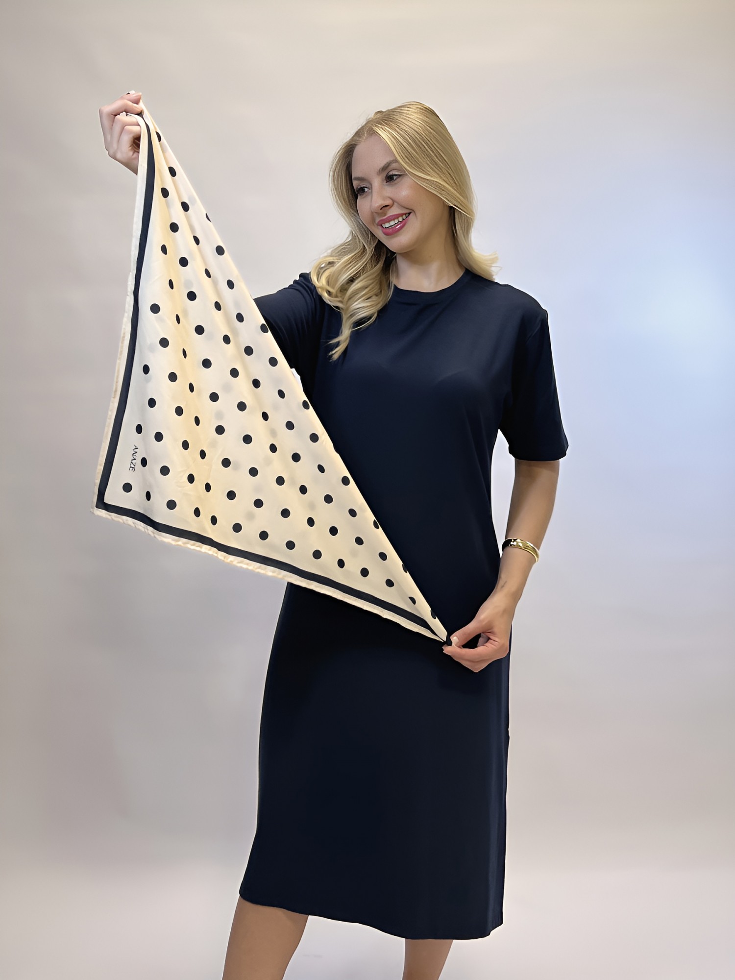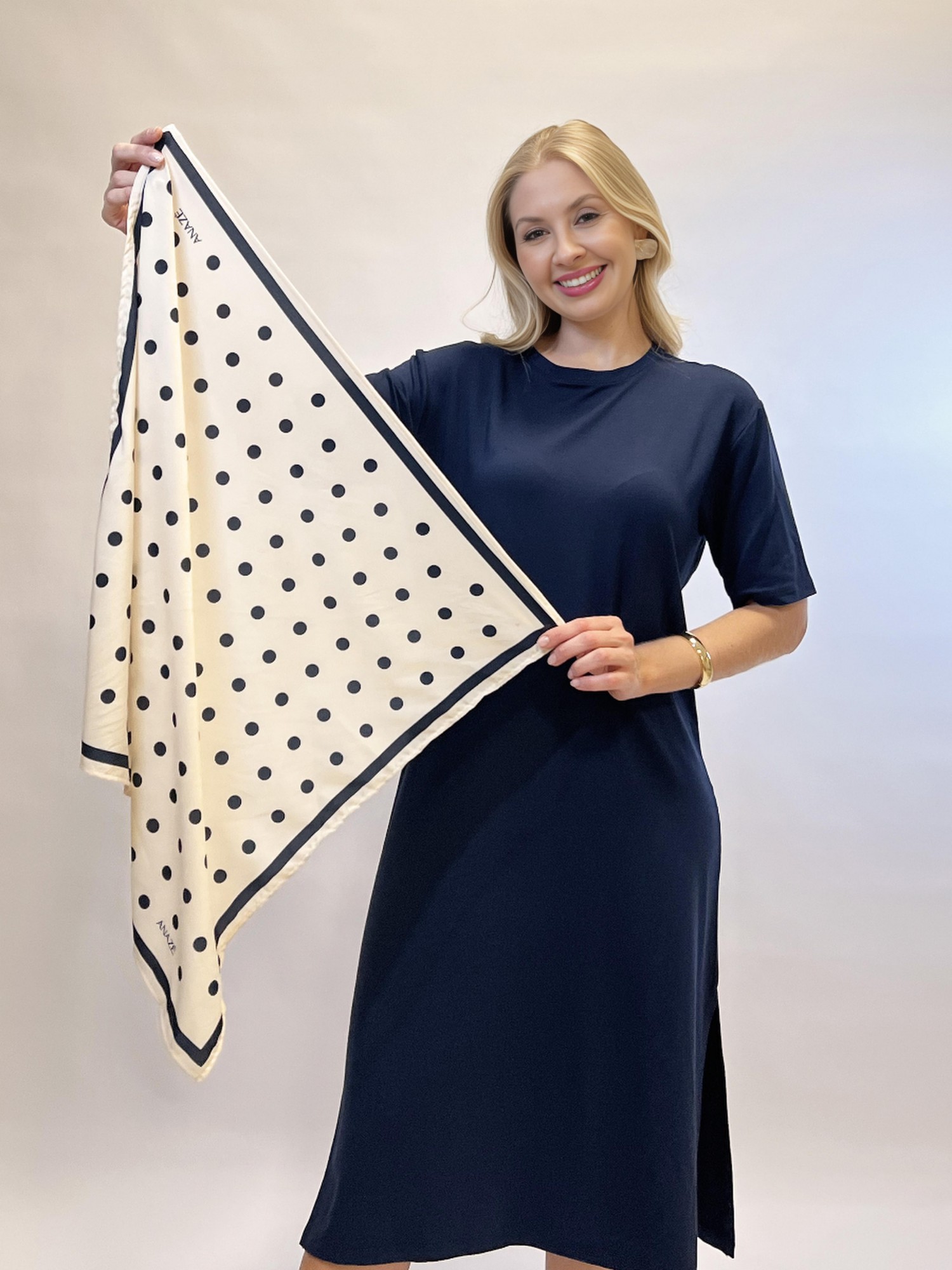 O Lenço Feminino Acetinado Anazê é o toque final que transforma qualquer produção com leveza e elegância. Confeccionado em tecido acetinado de poliéster com elastano, ele oferece brilho sutil, toque macio e caimento fluido — combinação perfeita para um acabamento sofisticado. Sua estampa poá clássico em marinho resort sobre fundo off-white adiciona charme atemporal ao look. O contraste do marinho traz profundidade e modernidade na medida certa, mantendo a versatilidade para combinar tanto com tons neutros quanto com cores mais suaves e contemporâneas. Com 70x70 cm, é um acessório versátil que permite múltiplas formas de uso: no pescoço, para um visual elegante; na cintura, como cinto; no cabelo, para um estilo leve e moderno; ou na alça da bolsa, garantindo um toque extra de personalidade. Mais do que um detalhe, o lenço é o acessório que eleva a camiseta e renova o visual com charme e autenticidade.