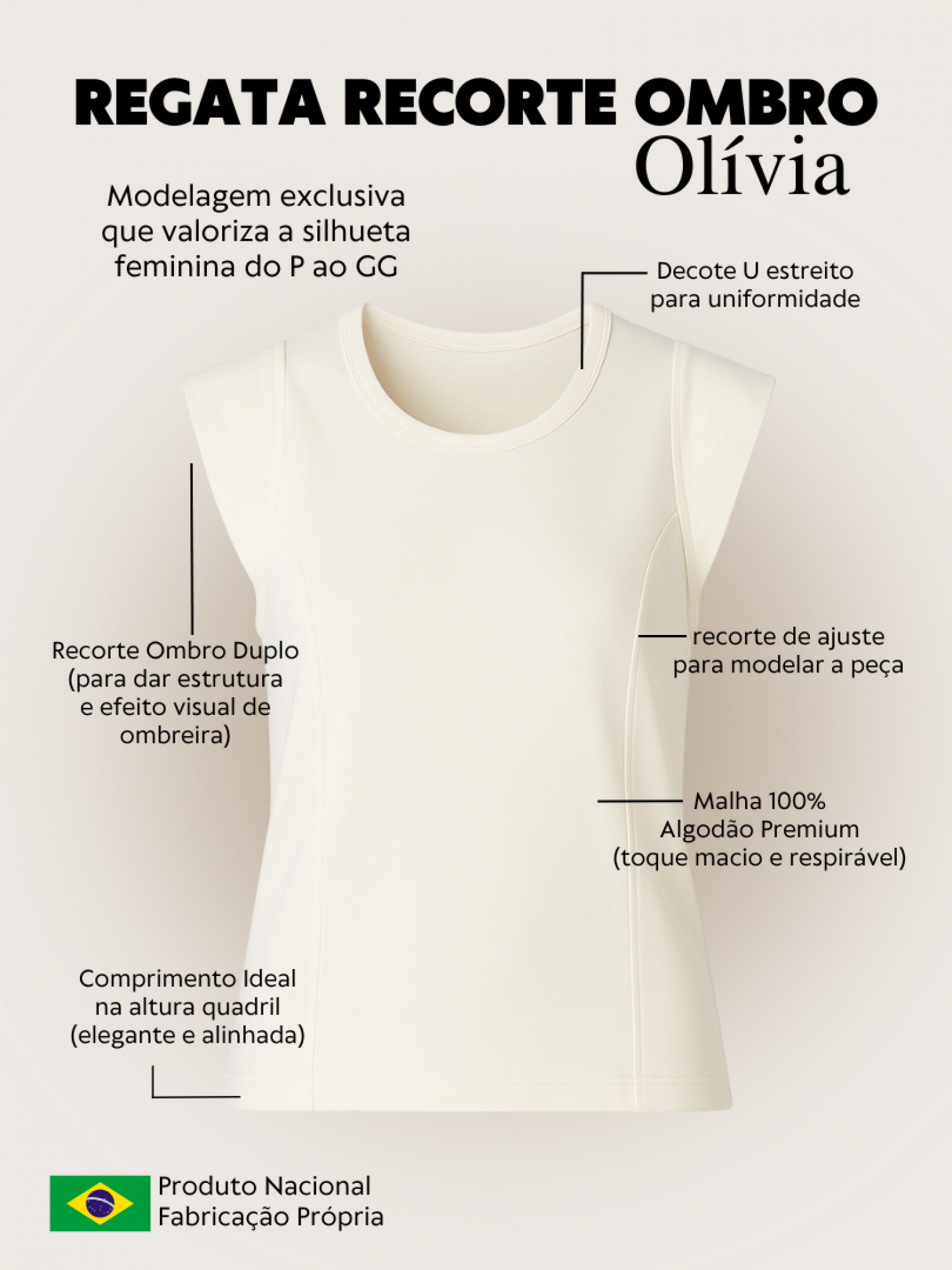 A Regata Feminina 100% Algodão Olívia – Branca é confeccionada em malha premium que não dá bolinha, não deforma e oferece toque macio e respirável. Seu design moderno conta com recorte lateral para um caimento mais alinhado e recorte nos ombros, que cria efeito de ombreira e deixa o visual elegante e atual. A gola estreita traz acabamento refinado, enquanto o comprimento na altura do quadril garante praticidade. Uma peça versátil, minimalista e perfeita para compor looks do dia a dia com estilo.